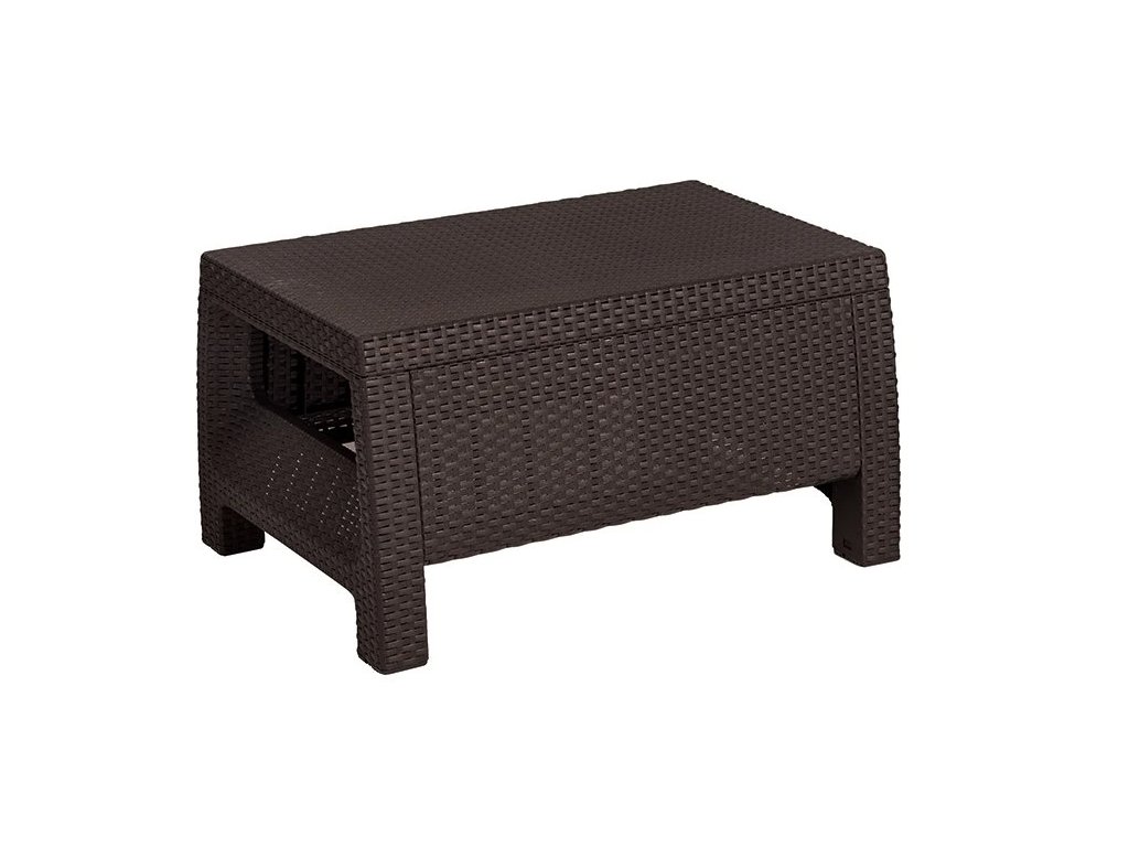 Souprava v elegantním hnědém odstínu s béžovými podsedáky obsahuje dvě prostorná křesla, dvoumístnou pohovku a nízký odkládací stolek, což z ní dělá ideální řešení pro venkovní posezení s rodinou i přáteli.