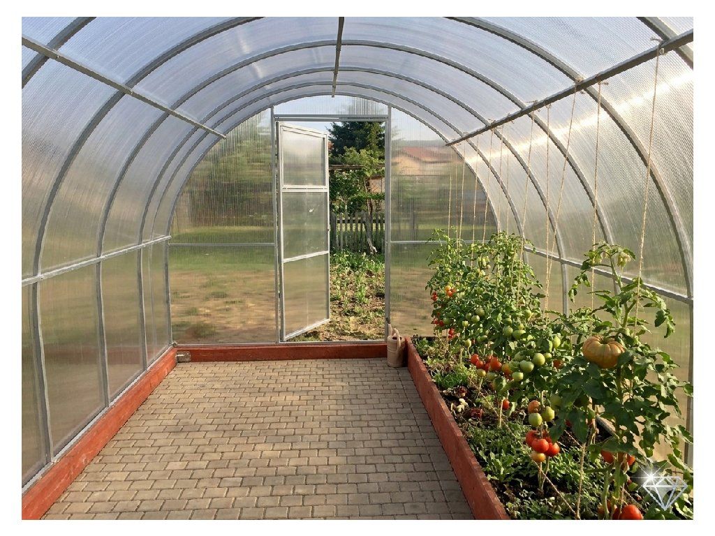 - Rajčata, papriky, okurky — výška 2 m umožní pěstování i vysokých odrůd. Na 12 m² se vejdou dvě řady záhonů s průchodem uprostřed. Dvoje dveře usnadní manipulaci s kolečkem a zavlažovacím vybavením.