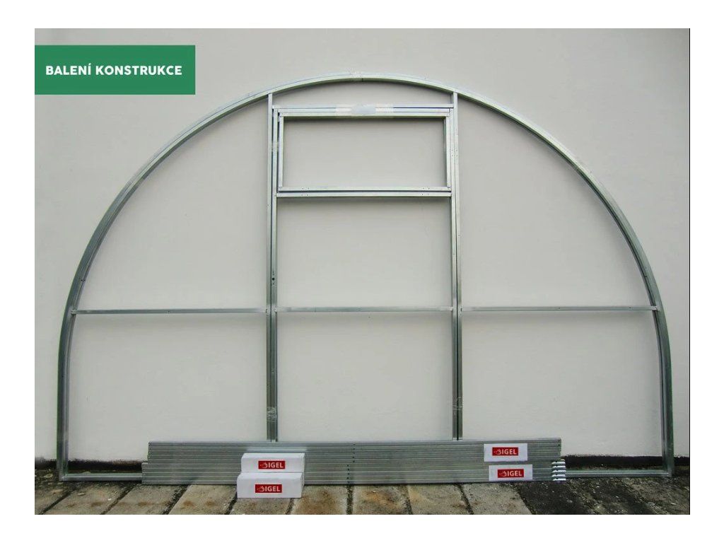 Čela a oblouky jsou dodávány předsvářené — žádné skládání z jednotlivých trubek, montáž je výrazně rychlejší než u srovnatelných modelů. Zasklení tvoří čirý dutinkový polykarbonát 4 mm s UV ochranou a zárukou 10 let. Pro střešní větrání doporučujeme přikoupit střešní okno LEGI.