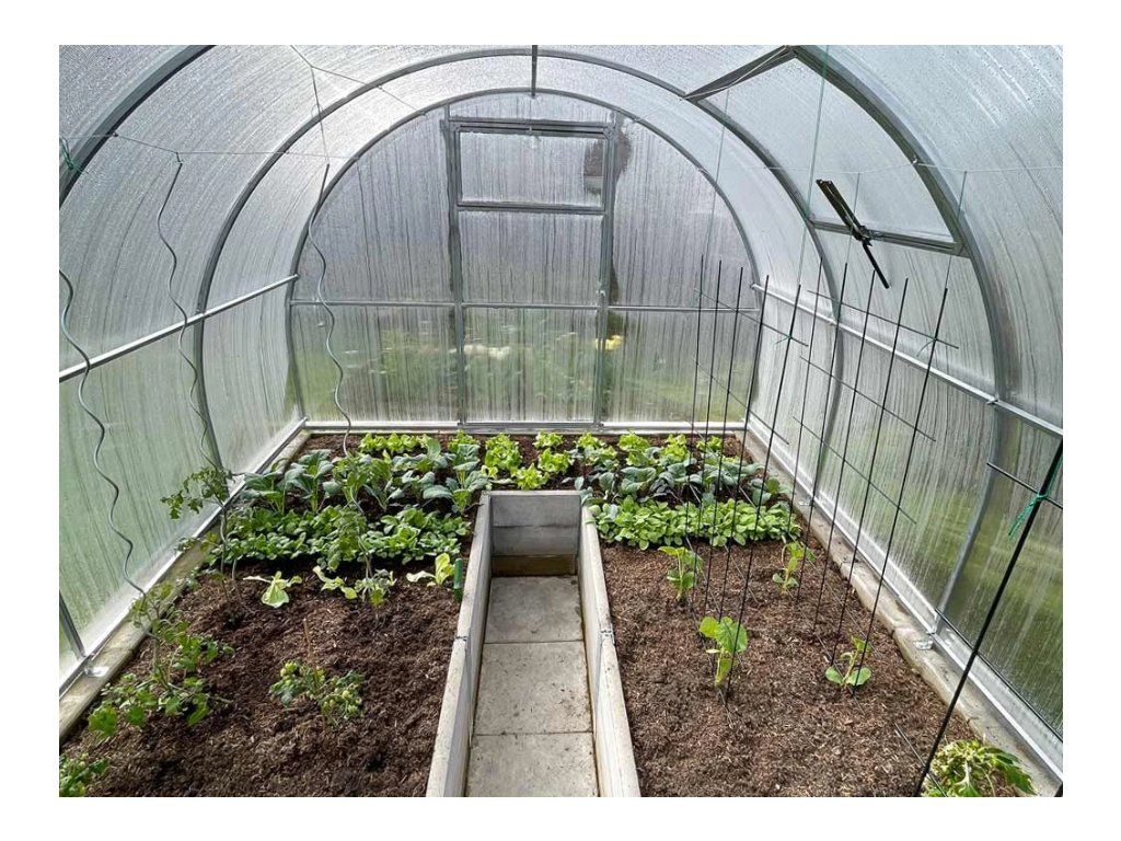 - Rajčata, papriky, okurky — výška 2 m umožní pěstování i vysokých odrůd. Na 12 m² se vejdou dvě řady záhonů s průchodem uprostřed. Dvoje dveře usnadní manipulaci s kolečkem a zavlažovacím vybavením.